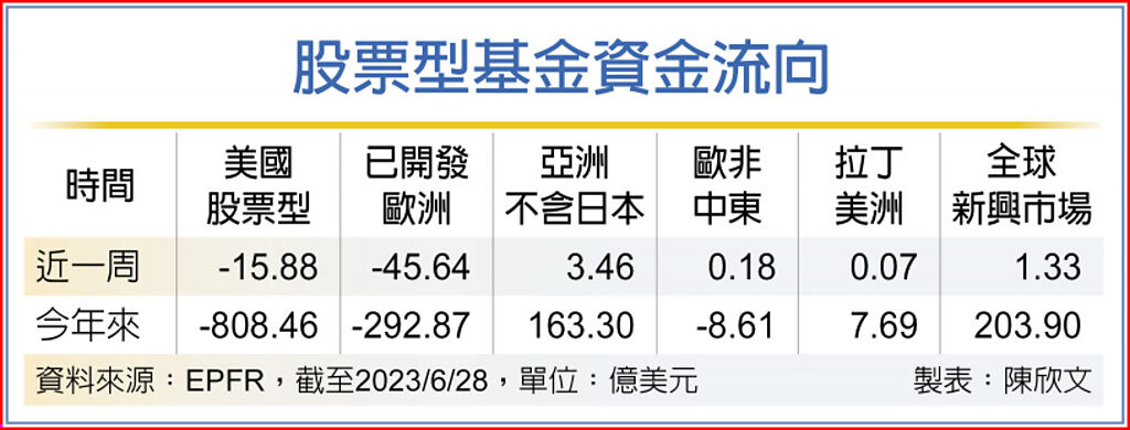 美國最新經濟數據顯示經濟仍有韌性,但歐美英央行近期仍釋出鷹派言論,股市投資情緒在多空交錯下漲跌互見,資金流向也分歧,過去一周美國與已開發歐洲股票基金資金呈現淨流出,其餘全球新興市場、亞洲(不含日本)、歐非中東及拉美等迎資金淨流入。