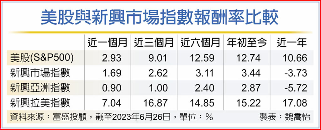 AI概念發燒,美股科技股飆升,6月創今年新高,但經濟衰退潛在風險仍存在,法人認為,據最新數據顯示,美國經濟活動減速跡象明顯,今年出現衰退的可能性不容忽視,建議可適度減碼美股,反觀新興市場受惠大陸重新開放,有機會成為下一個接續上漲標的。