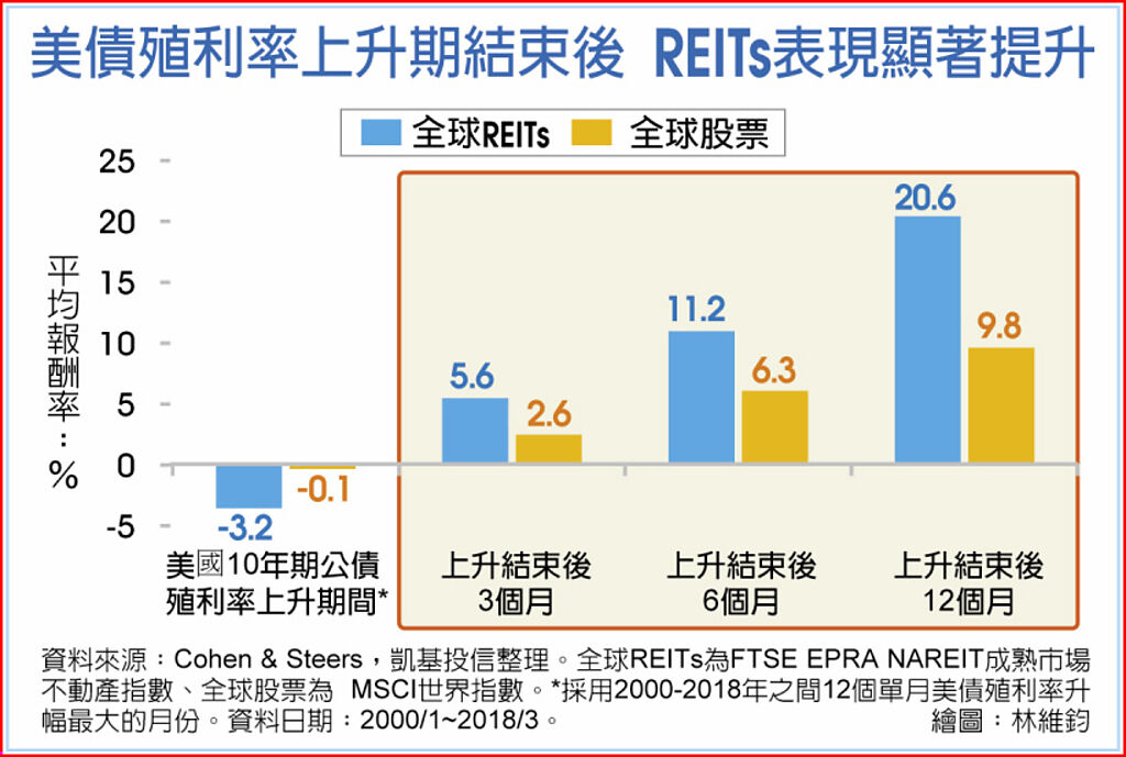 歷史數據顯示,當美債殖利率上升周期結束後三個月,全球REITs平均繳出5.6%報酬,同時間全球股票繳出2.6%;結束後六個月,全球REITs繳出11.2%報酬,全球股票則繳出6.3%;結束後一年,全球REITs平均報酬依舊以20.6%,遠勝全球股票的9.8%,顯見當美債殖利率處於下降環境,REITs投資價值可望顯著提升。