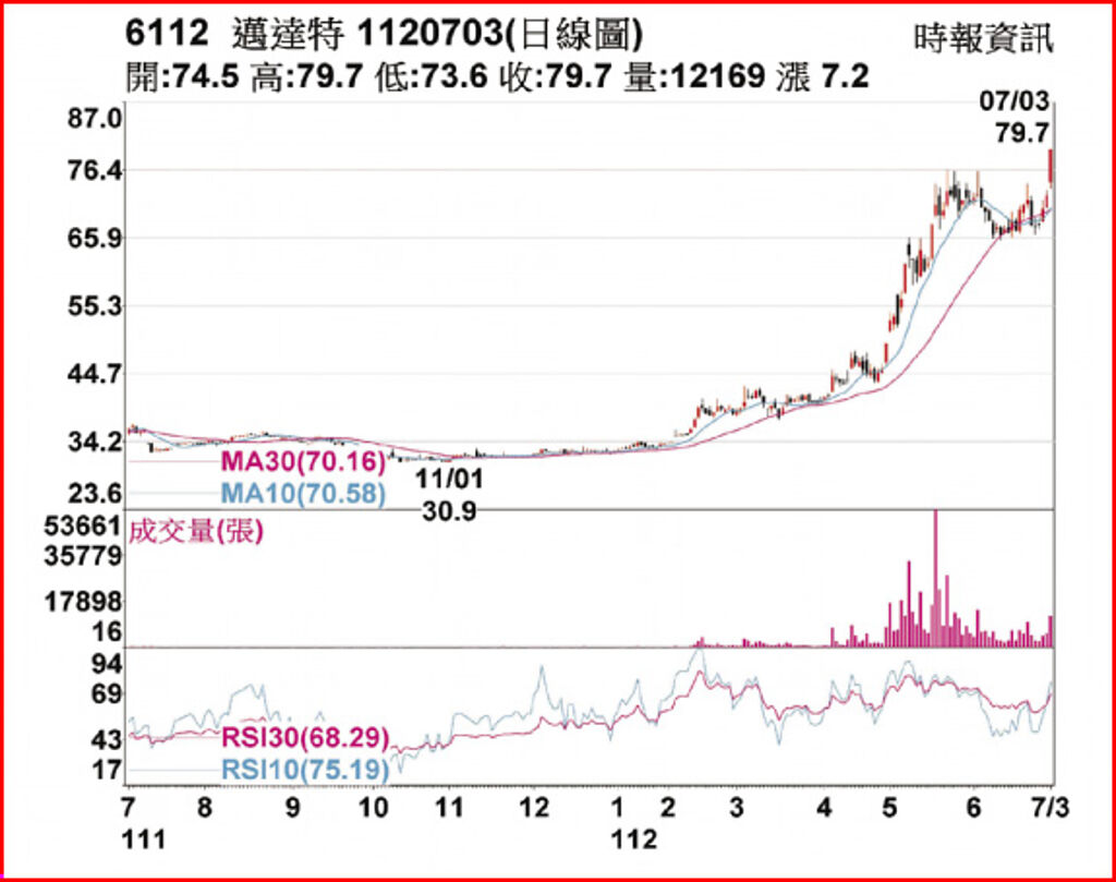 邁達特(6112)3日開盤不久後,隨即攻漲停鎖死,以79.7元作收,拉出一根長紅K線,股價站上周線、季線及月線。單日成交量為1.2萬張,較前一交易日放大逾一倍。三大法人3日合計買超1,174張。