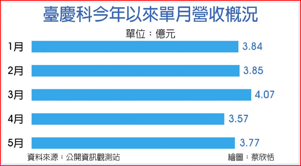 至於短期景氣,臺慶科表示,車用領域的訂單仍然穩健成長,逐季成長應沒有太大問題,但非車用訂單則要看電子五哥未來的拉貨情況,雖然景氣能見度還是不高,但是與今年上半年相較,第三季還是有機會優於第一季、第二季,下半年也可望優於上半年。