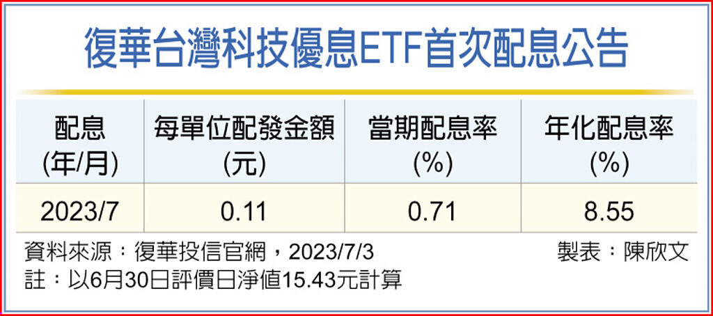 創下今年來ETF募集最佳成績的首檔台股月配息ETF─復華台灣科技優息(00929)3日公布首次配息金額。復華投信官網公告00929收益分配期前公告,基金每受益權單位預估配發0.11元,以評價日6月30日淨值15.43元計算,預估單次現金殖利率0.71%、年化殖利率為8.55%。