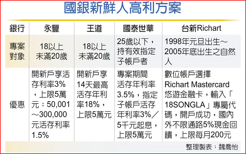 今年民法成年年齡下修,滿18歲可自行開立銀行帳戶,永豐、國泰世華銀、台新、王道銀行都針對年輕、新鮮人祭出高利或優惠吸睛,包括永豐銀活儲利率3%3%、國泰世華銀活存年利率3%、王道銀14天最高活存年利18%、台新銀開戶成功持特定卡消費有5%現金回饋,但有些優惠有限額或期間限制。