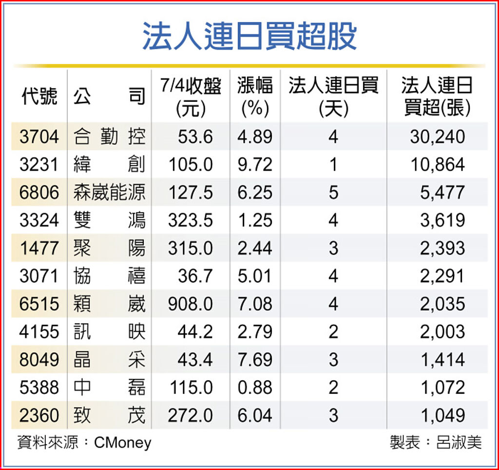 從39檔個股中篩選三大法人近來積極買超,連一(由賣轉買)~五日買達1,000張以上,合勤控獲連四日買超逾3萬張最多,緯創獲法人回頭買超達1萬餘張,改掛綠能環保類股的森崴能源,則獲法人連五日買超5,477張,散熱股雙鴻法人連四日買超3,619張,此外,聚陽、協禧、穎崴、訊映、晶采、中磊、致茂等,各獲法人連續多日買超一、二千張。