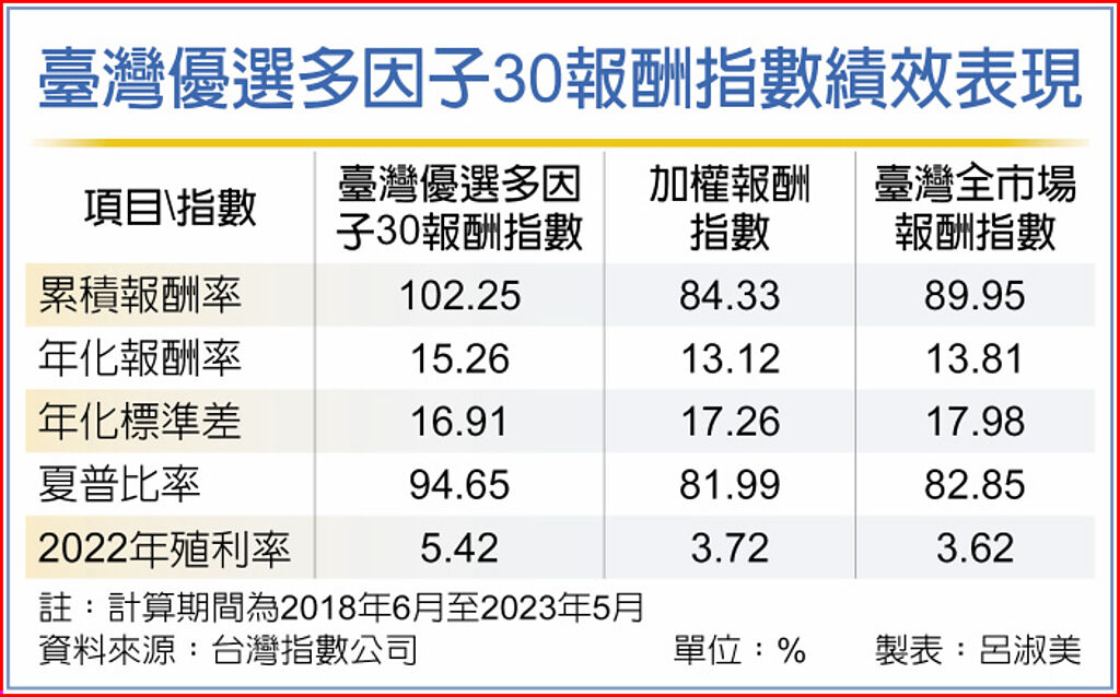 臺灣優選多因子30指數,於每年5月及11月進行成份股定期審核。台灣指數公司表示,臺灣優選多因子30指數,成份股兼具市值代表性及多因子特性,期可藉由指數化商品發行,提供投資人參與多元投資的便利管道。 |