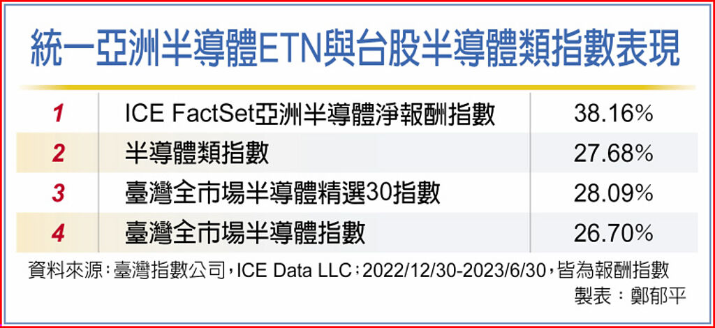 受惠AI浪潮與地緣政治紅利,統一亞洲半導體ETN所追蹤的ICE FactSet亞洲半導體淨報酬指數,近一個月漲幅較台股半導體類股指數高出10%,其指數成分股包含台日韓主要半導體大廠台積電、三星、SK海力士、東京威力科創及愛德萬測試。