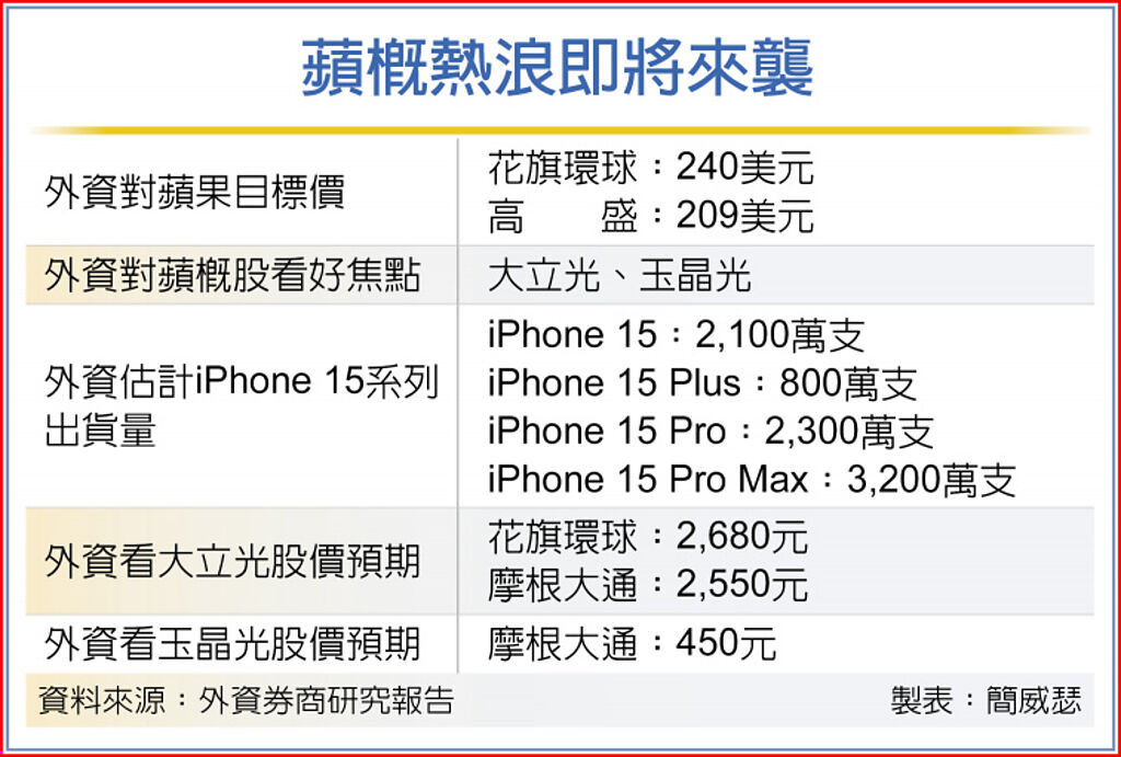 若以iPhone 15系列各機種出貨來看,摩根大通估計,iPhone 15、15 Plus、15 Pro、15 Pro Max出貨各是2,100萬支、800萬支、2,300萬支與3,200萬支,二款Pro新機占整體新iPhone的出貨比重,比起iPhone 14時的產品組合,有更向高階機種靠攏的跡象。楊維倫強調,現在挑選iPhone概念股更重選擇性,最青睞光學雙雄,大立光推測合理股價高達2,550元、玉晶光則是450元。