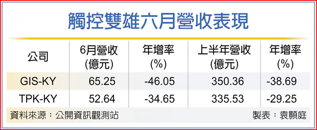 觸控雙雄6月營收出爐,因為iPad拉貨仍在低檔,TPK-KY宸鴻(3673)6月營收也不理想,月減4.3%、來到52.64億元,累計第二季合併營收約162.3億元,季減6.3%。GIS-KY業成(6456)6月合併營收約65.25億元,月減7.32%,累計第二季合併營收約206.6億元、季增43.73%。