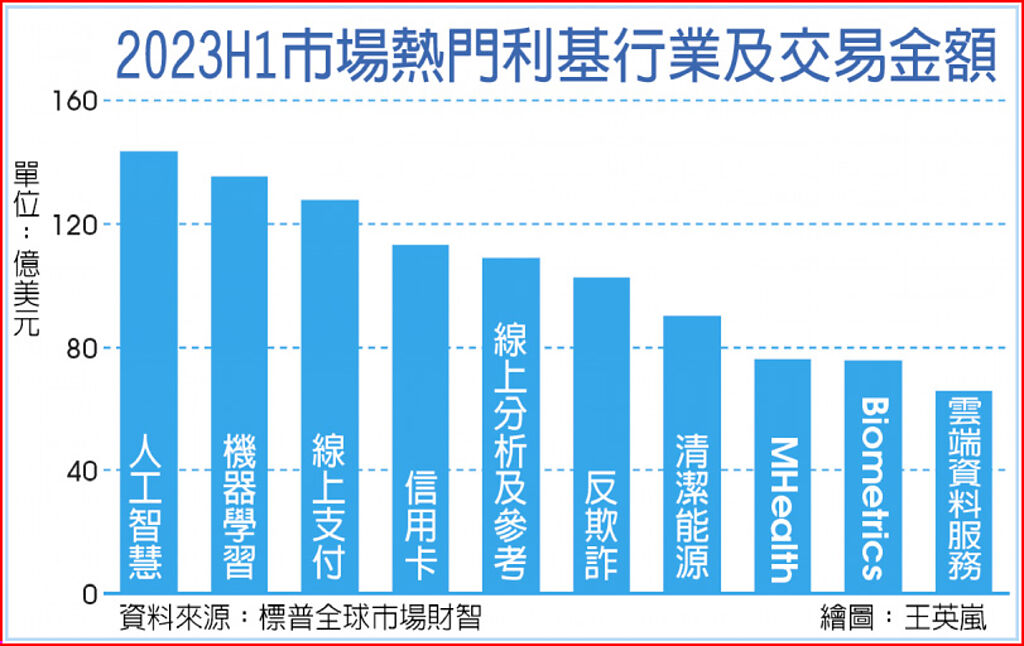 今年上半年火紅的AI晶片、ChatGPT,不僅帶動台、美科技股大漲,根據標普全球市場財智團隊的追蹤,PE市場的熱門利基行業也聚焦在AI、機器學習領域,上半年交易累計資金高達143.5億美元,135.1億美元;而金融科技領域向來最熱、也競爭最激烈的數位支付亦湧入127.6億美元完成交易,相當成熟金融商品的信用卡和線上分析的交易金額,還超越反欺詐技術的90億美元,透露出私募股權金主和募資方與實務市場相當連結。
