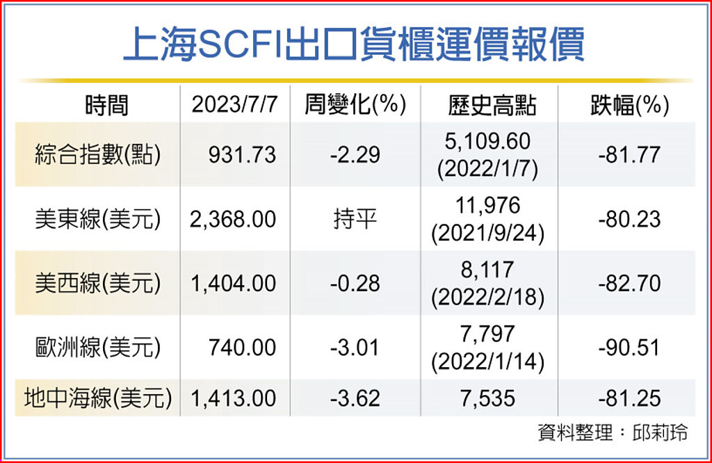 SCFI 7日上海到歐洲每20呎櫃運價740美元,下跌23美元、跌幅3.01%;到地中海線每20呎櫃1,413美元,下跌53美元、跌幅3.62%;美西線每40呎櫃運價1,404美元,下跌4美元、跌幅0.28%,美東每40呎櫃運價2,368美元,開平盤。