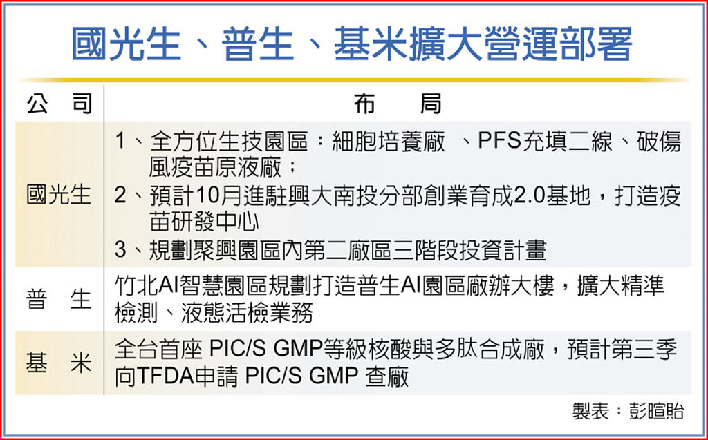 因應健康商機活絡、推展海外布局,包括國光生(4142)、普生 (4117)、基米(4195) 等生技業者新廠蓄勢待發。其中最受矚目的是國光生,公司決定在台中潭子打造全方位生技園區,建置先進流感疫苗廠、自動化充填包裝線及細胞培養廠,並與中興大學簽署育成進駐合約,預計10月起,進駐興大南投分部創業育成2.0基地,共同合作投入疫苗技術研發,打造疫苗研發中心。