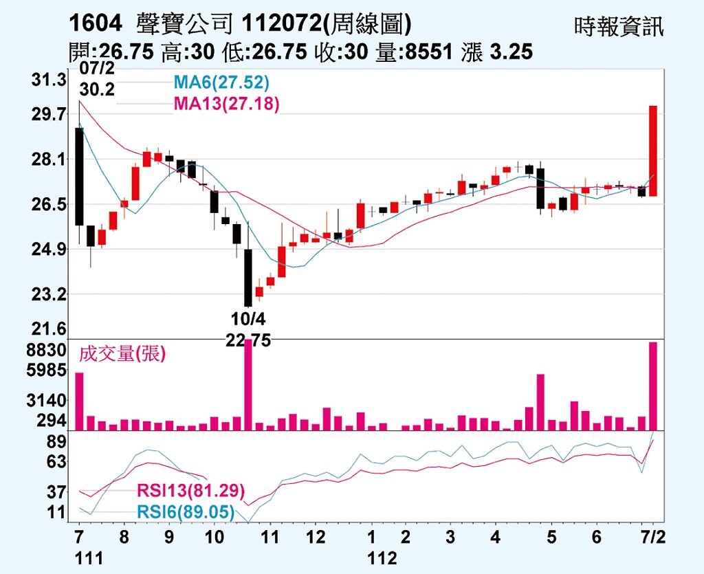 聲寶(1604)受惠於天氣轉熱、進入空調銷售旺季,以及近期關係企業瑞智股價大漲帶動,上周五亮燈漲停收30元、並完成填息,創近一年新高,以周線來看,自去年10月創21.53元低點後,便緩步上揚,上周帶量長紅K棒帶動短中長均線翻揚,周KD交叉向上,有機挑戰前波高點32.8元。