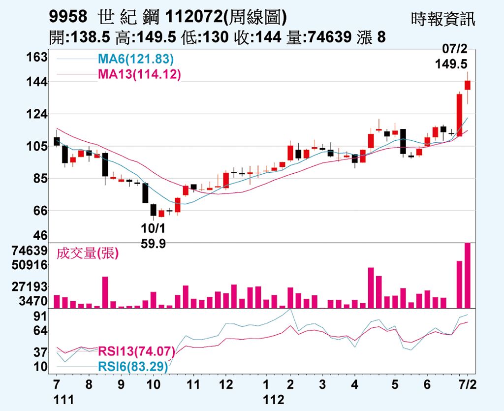世紀鋼(9958)近期股價表現亮眼,主要受惠於接單及營運表現出色,近期外資、投信陸續歸隊,7日盤中一度來到149.5元,最終股價收在144元,連兩日上漲,單日漲幅高達5.49%,預期下半年營運可望比上半年更佳。