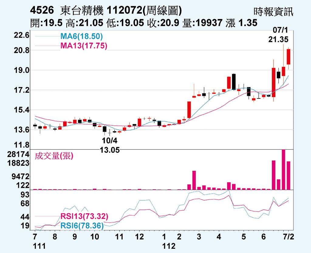 東台(4526)卡位布局航太、離岸風電及電動車電池等新能源相關產業有成,目前在手訂單回升至50億元,轉投資榮田精機計畫明年登錄興櫃,東台也可獲益。外資上周連續三個交易日買進,7日三大法人買超446張,推升股價上漲1.05元而以20.90元收盤,突破5日均線。榮田資本額4.24億元,客製化生產大型立車等機台,客戶涵蓋航太及風力發電等產業,去年本期淨利1.24億元,EPS為3.04元。榮田預計釋股2,703張,認股價格46元,認股基準日11日。東台目前持有榮田54.47%股份,經這次釋股後,年底持股降至45%。 |