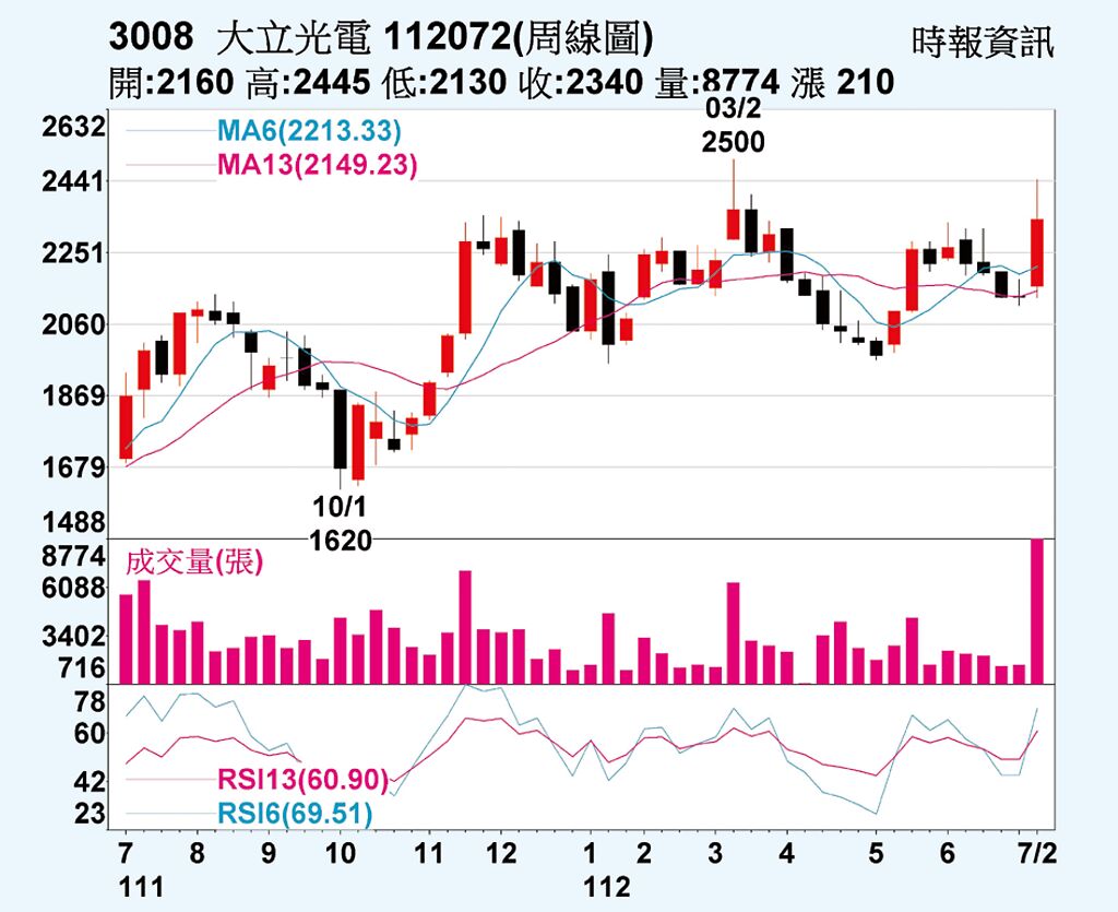大立光(3008)上周公布6月營收26.96億元,月增2.64%、年減21%。法人認為,大立光營收已經走過最低谷,下半年即將落底反彈。美系客戶將於9月發布新手機,並獨家採用大立光的潛望式鏡頭,可望拉動大立光營收。大立光董事長林恩平也於股東會後表示,7月將比6月好、下半年將比上半年好。