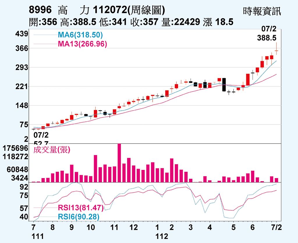 高力(8996)在綠能、AI雙題材,以及營運成長帶動買下,吸引買盤追捧,上周五量縮盤整收357元,上漲1元,成交353張。以周線來看,自去年7月約57元附近起漲,今年4月回測月線後再啟攻勢,上周盤中一度創下388.5元歷史高點,短、中、長均線多頭排列,各項技術指標續熱,多頭未退燒,惟周KD指標呈現高檔鈍化。高力訂單能見度高,因應訂單成長並陸續擴充產能,板式熱交換器、熱能產品二大產品線出貨持續成長,6月營收4.61億元、年增93%,為歷史單月次高,上半年營收22.78億元,年增92%。