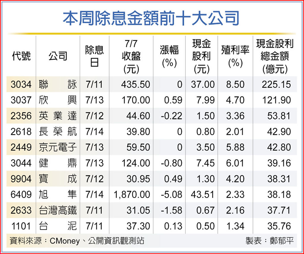 至於電子股,聯詠每股配息37元,換算現金殖利率高達8.9%,11日除息秀將重磅登場,而欣興、英業達、京元電子等除息大戲也都將在本周揭開序幕,當中聯詠、欣興分別將發出225.15億元、121.9億元現金股利、最受市場矚目。