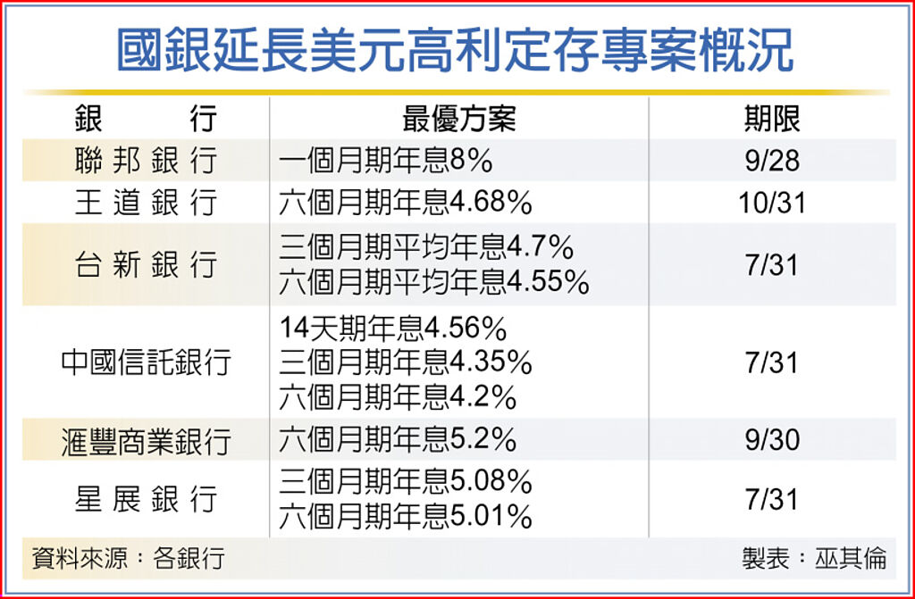 各銀行紛紛延長專案內容,方案至少延長至7月底,比較近期各銀行利率水準,專案利率水位多在4.5%之上。舉例來說,王道銀行3個月期美元定存年利率達5%、6個月期年利率達4.68%;中信銀14天期年利率最高5%、3個月期4.35%、6個月期也有4.2%;台新銀主推3個月期平均年息4.7%、6個月期平均年息4.55%。外銀商方面,滙豐商銀6個月最高5.2%,為目前市面上同天期最高。