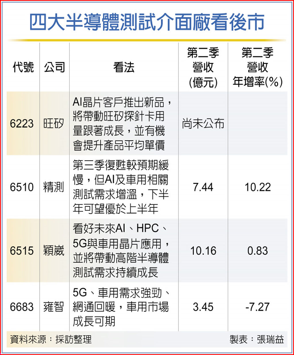 半導體四大測試介面廠第二季營收擺脫谷底,其中精測(6510)、穎崴(6515)第二季營收均優於上季,市場預期旺矽(6223)第二季營收可望呈現季增,四大半導體測試介面廠今年均看好AI應用加速回溫,再加上車用需求也續增,下半年營運可望同步繳出優於上半年成績。