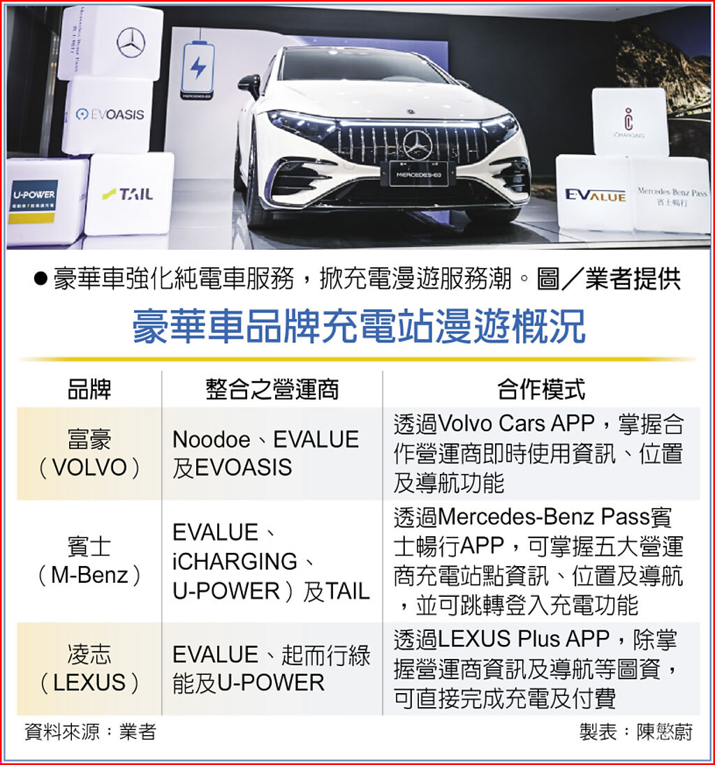 為強化充電網絡服務,豪華車品牌掀「充電漫遊」結盟風潮。繼台灣富豪(VOLVO)及和泰淩志(LEXUS)之後,台灣賓士也宣布,旗下「賓士暢行APP」自7月起升級充電服務,整合五大充電營運商與充電站點資訊,登入單一平台可掌握不同營運商充電站點圖資。