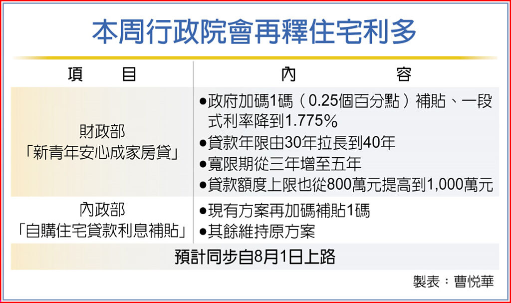 行政院官員證實,上周四(6日)行政院會上已初步敲定財政部的「新青年安心成家房貸」及內政部的「自購住宅貸款利息補貼」兩方案。其中,自購住宅貸款利息補貼擬較現今再加碼1碼,補貼年限維持最長20年、含付息不還本寬限期最長五年,貸款額度最高250萬元(台北市)。
