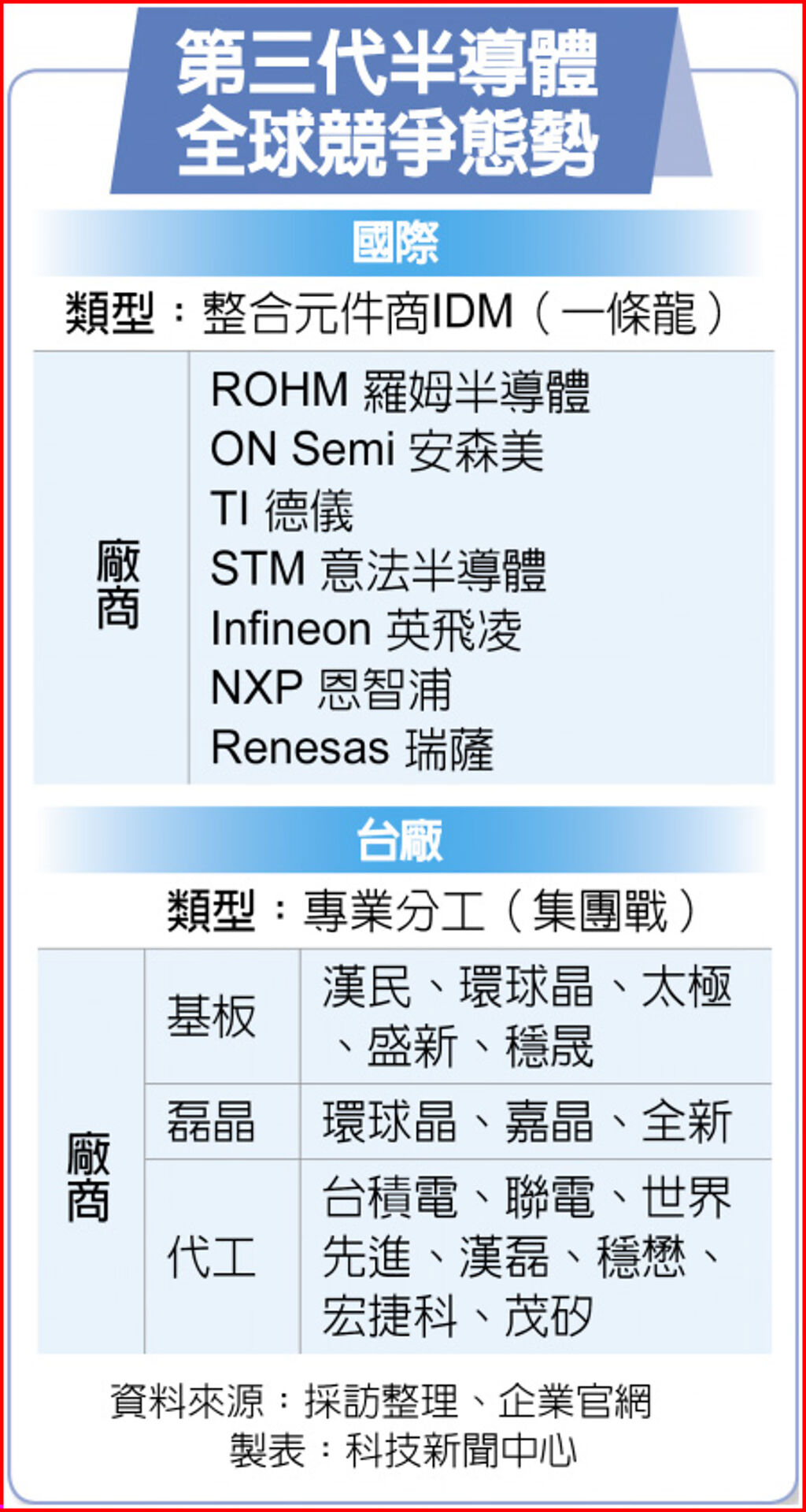 台灣第三代半導體基板廠由環球晶、漢磊及盛新三分天下,製造則由台積電、聯電、世界先進、晶成及積亞等為主,國際IDM廠則為Wolfspeed、英飛淩、意法、ON Semi及ROHM等。