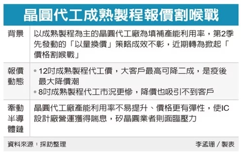 半導體景氣復甦腳步不如預期,供應鏈透露,以成熟製程為主的晶圓代工廠為填補產能利用率,第2季先發動的「以量換價」策略成效不彰,近期轉為掀起「價格割喉戰」,12吋成熟製程代工價,大客戶最高可降二成,是疫後最大降價潮;8吋成熟製程代工市況更慘,降價也吸引不到客戶。