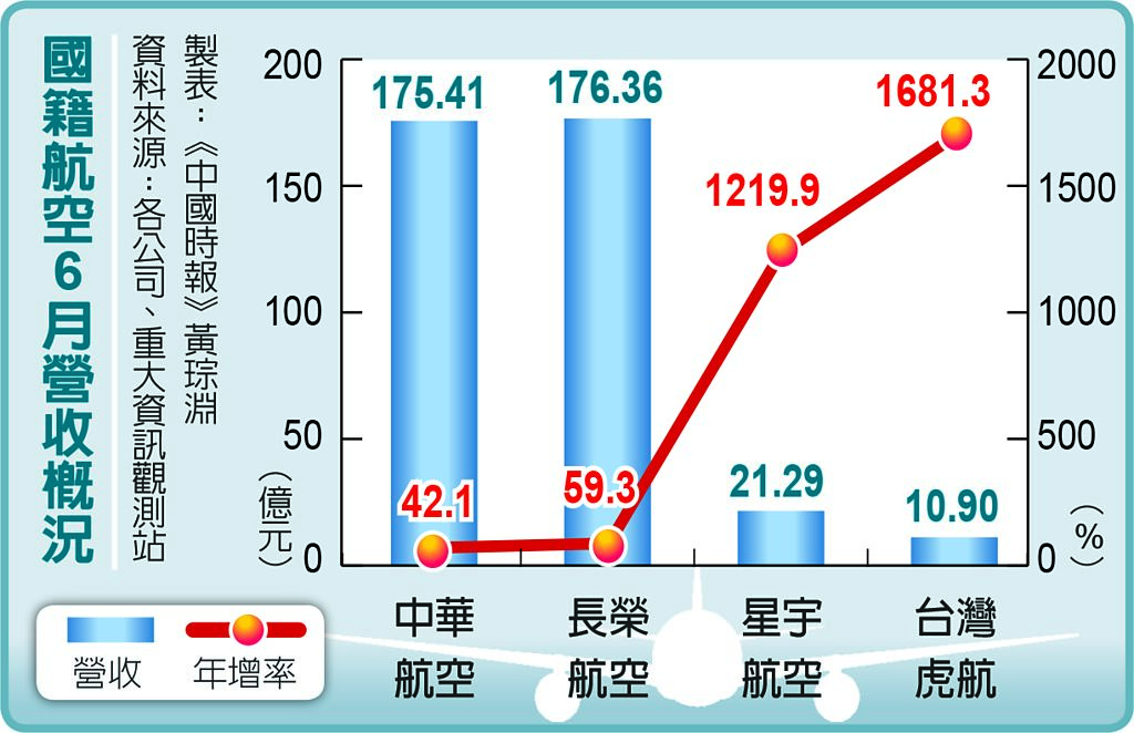 表現最突出的為國內唯一的低成本航空─台灣虎航,預計下月轉掛創新板,6月交出單月營收10.9億元的好成績,年成長16倍,也是台虎成立以來首度營收突破10億元,7、8月因屬暑假旺季,台虎的日本線票價動輒破萬,有望成為高票價紅利時代的最大受益者。