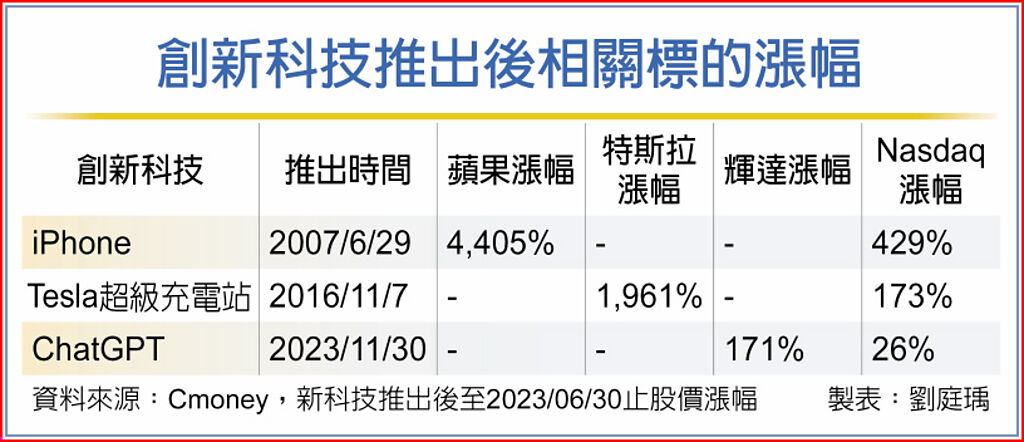 第一金投信指出,全球進入新AI時代,研判AI、自動化標的漲勢想像空間大,每一次顛覆式創新科技推出,總會驅動股價長波段漲勢,以iPhone為例,智慧型手機改變全人類的通訊及生活模式,蘋果第一隻iPhone在2007年推出,至今蘋果股價與那斯達克指數分別翻漲40倍及4倍以上。