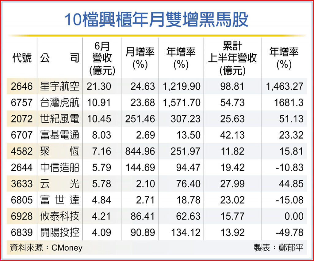 依照營收高低排序,共有星宇航空、台灣虎航、世紀風電、富基電通、聚恆、中信造船、云光、富世達、攸泰科技、開陽投控等入列;值得留意的是,除受惠疫後報復性旅遊潮帶動的航空股外,政策加持的再生能源、軍工國防也占有一席之地,業績面、題材面「雙利多」點火、前景看旺。