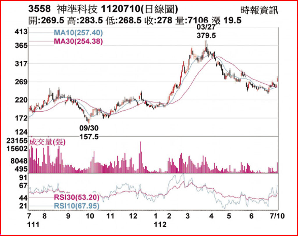 神準(3558)受惠季底拉貨,6月營收16.02億元、月增43.7%、年增13.6%,第二季由於客戶修正庫存季減7.8%,但上半年營收86.64億元、年增36.34%。近期走勢持續墊高,10日收盤時上漲7.54%,收278元,寫下波段新高。