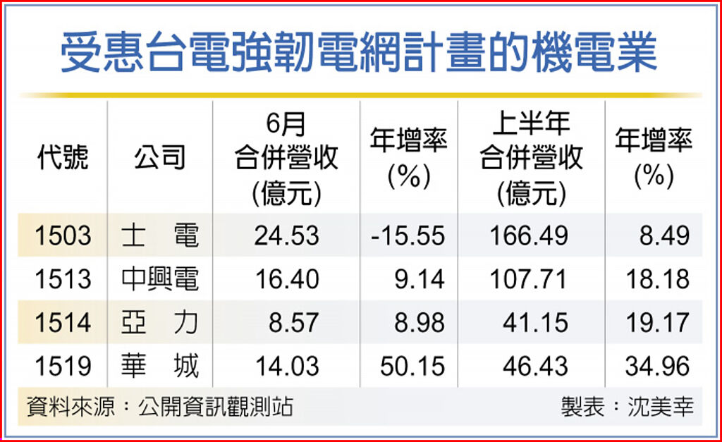 台電汰舊換新及強韌電網計畫,帶旺士電(1503)、中興電(1513)、亞力(1514)、華城(1519)等機電廠在手訂單超過百億元,加上近年跨足太陽能光電有成,今年營收及獲利戰新高。中興電、亞力、華城6月及上半年營收均改寫同期新高,華城第二季營收飆單季新高。