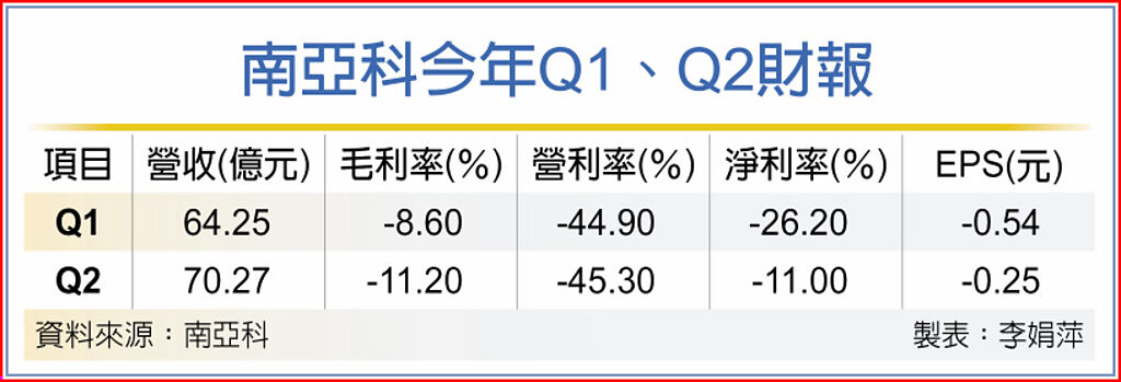 南亞科單季每股虧損0.25元(每股盈餘依加權平均流通在外股數30.98億股計算)。截至6月30日,每股淨值55.72元。 |