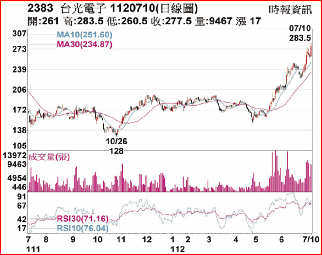 台光電(2383)第二季營收受惠6月AI伺服器急單,單季營收成長幅度優於市場預期,AI概念股輪漲至PCB族群,台光電10日盤中一度勁揚超過8%,終場漲幅雖然收斂至6.52%,收盤價277.5元仍創下2022年2月以來新高紀錄,投信法人自6月以來持續性回補台光電。