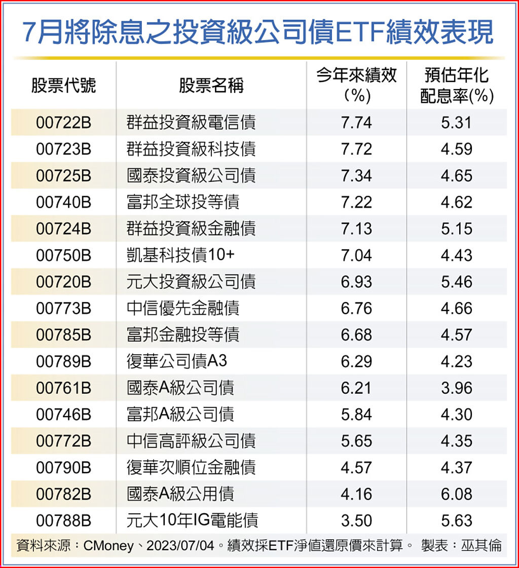 統計7月將除息的債券ETF共有32檔,其中投資級公司債ETF達16檔最多,這次預估年化配息率平均達4.7%,其中年化配息率估達5%以上包括群益投資級電信債(00722B)、群益投資級金融債(00724B)、國泰A級公用債(00782)、元大10年IG電能債(00788B)、元大投資級公司債(00720B),想參與除息的投資人不妨留意相關時程。