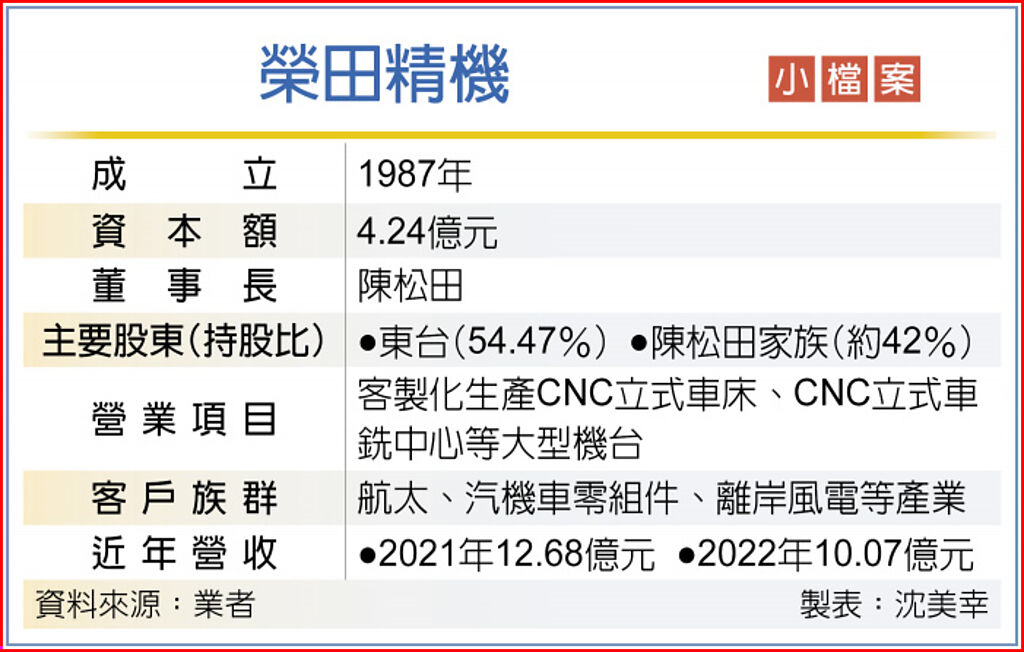 東台指出,東台17年前與榮田開始合作時,榮田年營收從6,000萬~7,000萬元,一路成長,最高曾達20億元。東台目前持股榮田54.47%,榮田董事長陳松田家族持股約42%。東台今年股東會通過榮田釋股案,優先讓東台股東依持股比認購榮田釋股,東台規劃今年底前將榮田持股比降至45%,儘管雖不再過半,但雙方仍維持合作。