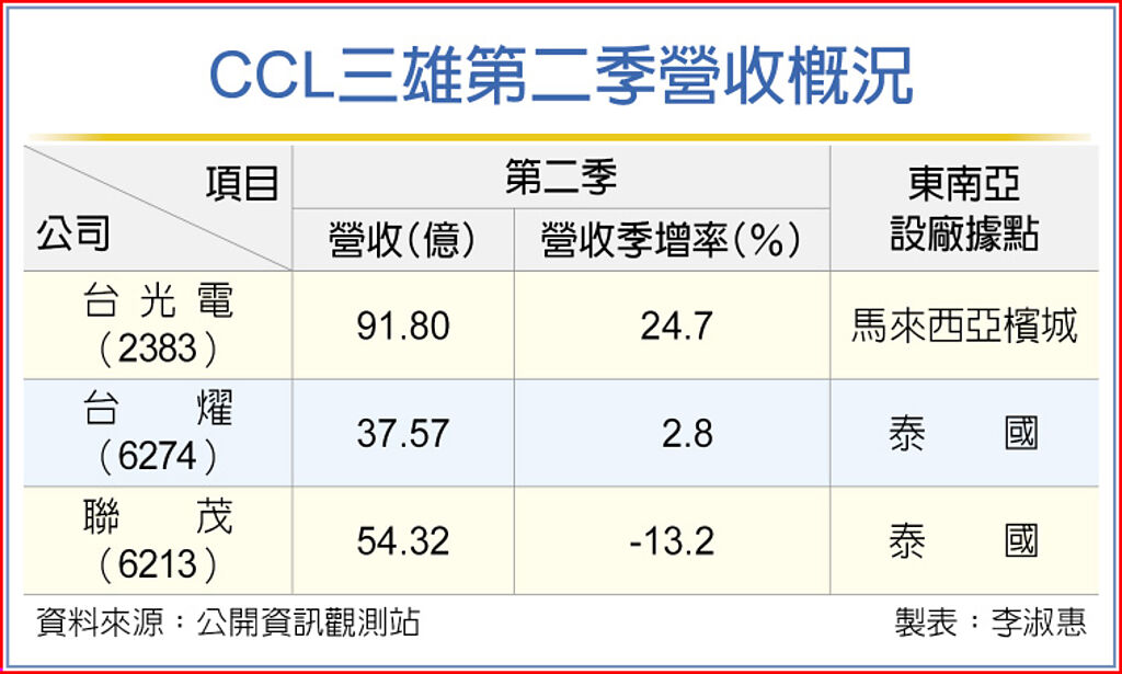 另外二家CCL廠台燿、聯茂,上半年也面臨景氣疲弱的衝擊,不過台燿自結第二季營收37.57億元,季增2.8%、年減21.6%,扭轉連六季衰退的頹勢,由於第二季可望擺脫海外盈餘匯回稅率的干擾,法人預期,將有利於第一季繳赤字財報的台燿轉盈。