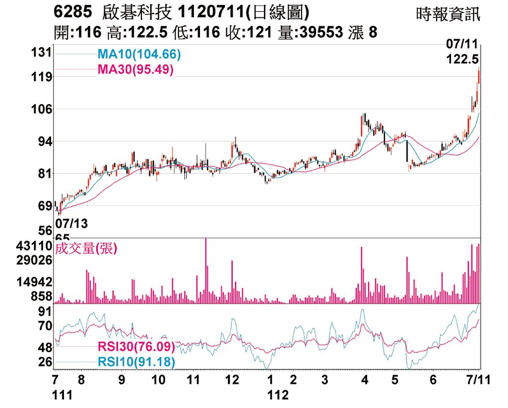 啟碁股價6月底時在94.8元起漲,該股7月以來在產業下半年展望正向,加上營收表現成長,股價拉出一波漲勢。 |