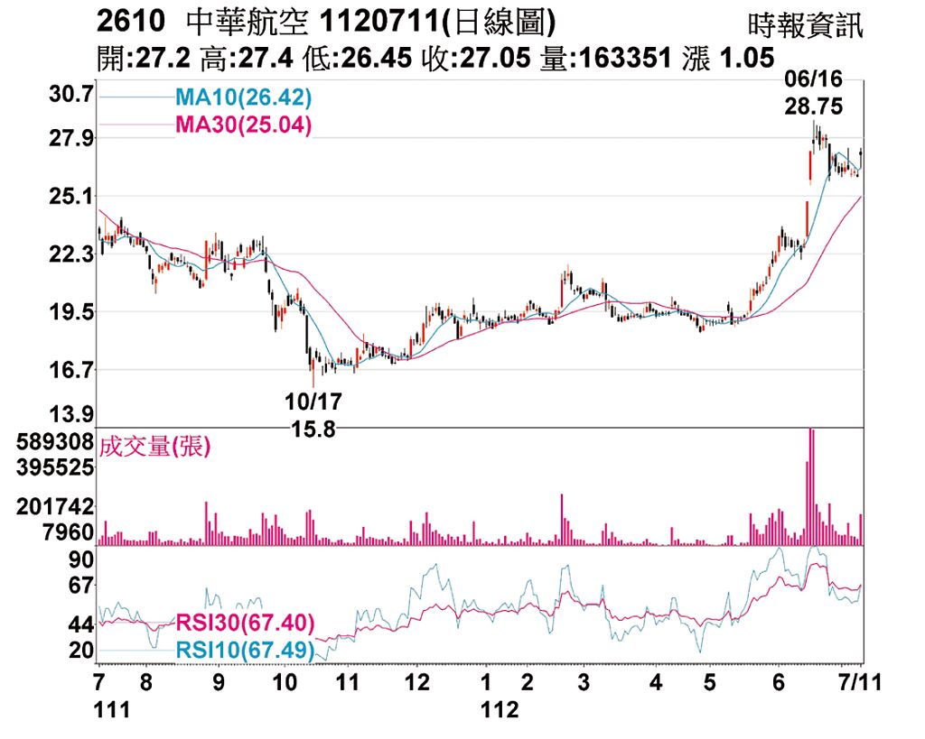 華航(2610)股價在6月16日見到28.75元波段高點後,漲多拉回,幸遇月線有撐,多頭乘勢再起,11日以27.2元小高盤開出,收在27.05元、上漲4.03%,尾盤雖未能突破開盤價,以黑K坐收,但KD在低檔形成黃金交叉,有利於多頭續攻,三大法人買超近2.73萬張,台股排第三。