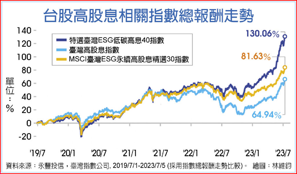 統計2019年7月1日至今年7月5日的近四年期間,相較於以殖利率單一因子篩選,增加ESG評鑑因子的高息代表指數,期間總報酬高近2成;同時結合低碳、高息、ESG三重因子的「台灣ESG低碳高息40指數」,期間總報酬又比雙因子代表指數再多出近5成、達到130%,顯示投資人選擇高息產品,不只應重視企業股利配發狀況,更應順應市場趨勢題材,有利於增加資本利得機會。