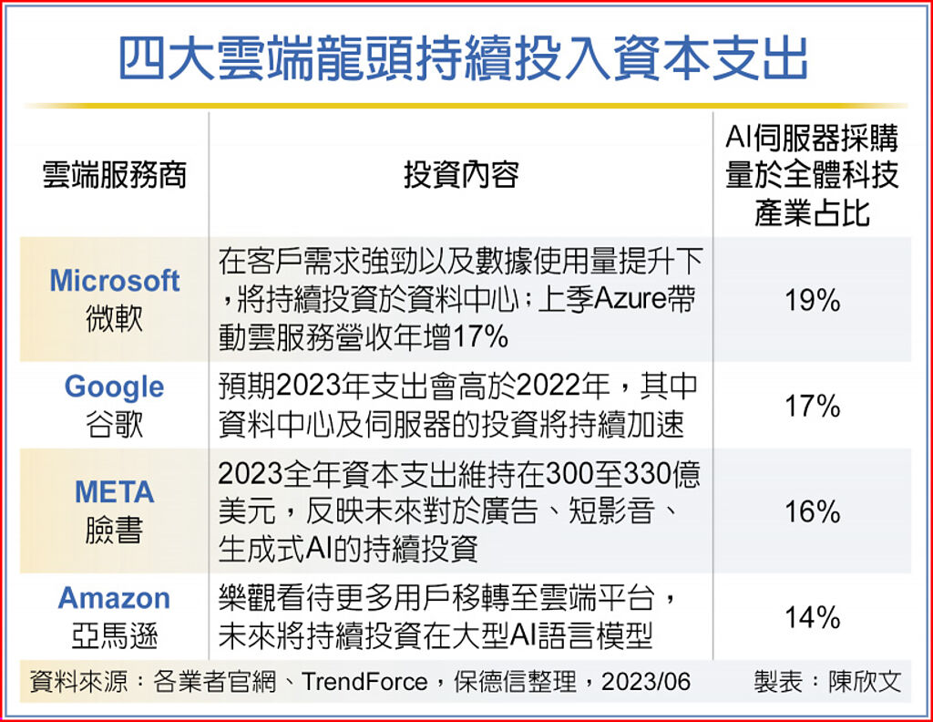 PGIM保德信全球新供應鏈基金經理人楊博翔表示,四大雲端龍頭大廠對AI帶來伺服器需求相當看好,不僅雲服務營收持續上升,資本支出也加速投入,為趕上這波數位轉型趨勢,必須搭配完善的相關基礎建設,因此包括Google、微軟等都表示,將強化資料中心與伺服器的投資,替伺服器相關的資料中心建置提供有利的支持與動能。