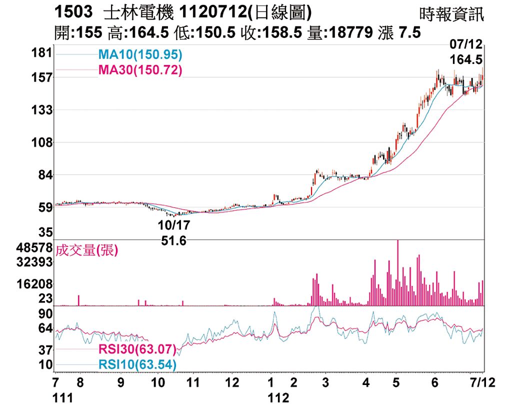 士電(1503)在手訂單超過百億元,加上極端氣候而造成台電供電吃緊,市場預期台電加快釋出汰舊換新變壓器及配電盤等重電設備訂單,士電將受益,湧現追價買盤。三大法人12日聯手買超2,449張,推升股價上漲7.5元、收158.5元,突破5日、10日及20日均線。