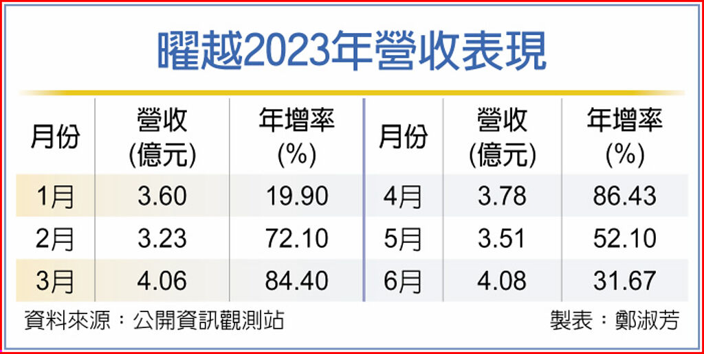 台北國際電腦展發威,受惠於久未謀面的經銷商回籠,帶動新機殼拉貨量成長,曜越6月營收4.08億元,月增16.25%、年增31.67%,寫下近26個月新高,第二季營收11.43億元亦較首季的10.87億元穩步向上,惟因去年基期較低,若以上半年累計營收22.26億元言之,年增率則高達53.36%。