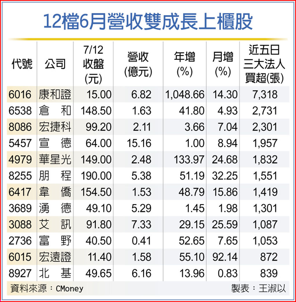 觀察上櫃公司6月營收優於5月及去年同期的雙增股有康和證、倉和、宏捷科、宣德、華星光、朋程、韋僑、湧德、艾訊、富野、宏遠證、北基等。