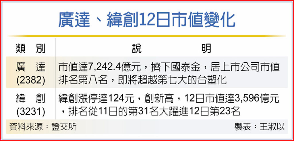 AI投資熱潮欲罷不能,資金湧入廣達(2382)、緯創(3231)2檔個股,激勵市值大躍進,廣達12日市值擠下國泰金(2882),居上市公司市值第八大,即將趕過台塑化(6505),緯創12日股價漲停,市值從前一日的第31名竄升至第23名,投資專家認為,多頭市場緊抓強勢股並順勢而為。