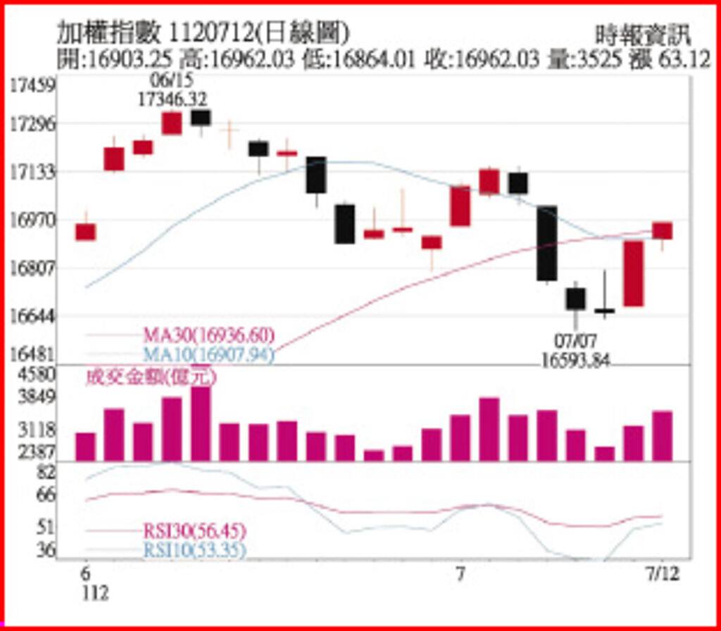 籌碼面,6月中以來外資在17,200點以上開始調節台股,期貨也同步減碼一度轉為空單1,738口,近日則持續建立期貨多單,現貨部位也同步買超,外資期現貨部位需持續留意;近期開始進入美股財報周,13日大立光法說,7月開始進入蘋果新機出貨,營收有機會開始月增;20日台積電法說,雖然彭博共識對於台積電第三季營收季增率約當14%,但近期不少外資已下修到低雙位數,反映第三季消費性旺季不旺的表現。