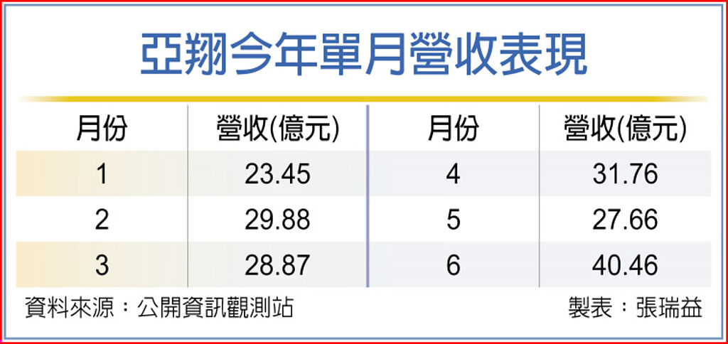 亞翔6月合併營收40.46億元,月增達46.3%、年增達43.04%,改寫歷史次高,第二季合併營收99.89億元,季成長21.51%、年成長達29.49%,同步改寫歷史次高,累計上半年合併營收182.1億元、年增達20.42%,續創同期新高。