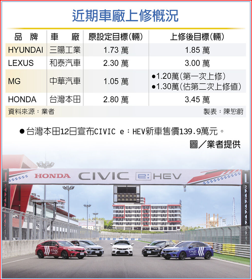 今年以來車市買氣夯!車廠上修全年業績目標動作一波接一波,台灣本田看好第11代Civic e:HEV及六代CR-V兩大重磅新車接連上市效益,上修本田(HONDA)品牌今年度在台銷售目標,自年初的2.8萬輛拉高至3.45萬輛,上修幅度逾23%。