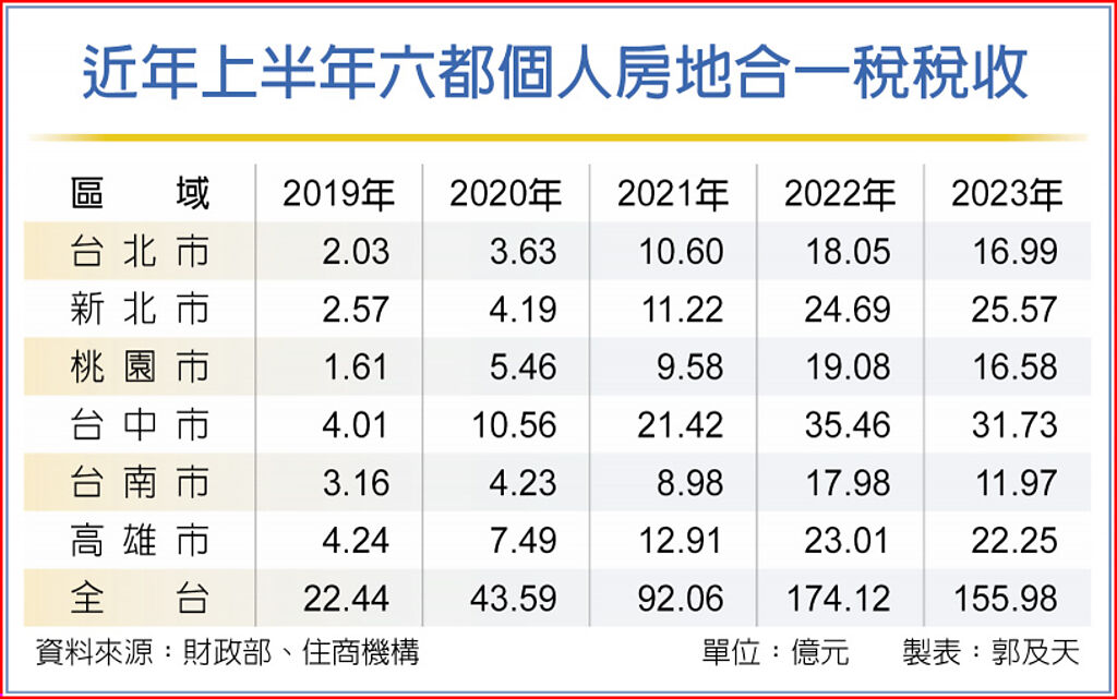 根據財政部統計顯示,今年上半年各縣市房地合一稅收明顯衰退,六都中僅新北市微幅成長3.6%,其餘五都衰退,又以台南減少33.4%最多;而非六都上半年稅收超過1億元的9個縣市中,僅有屏東縣、嘉義市及宜蘭縣稅收增加,其餘如新竹縣、新竹市、雲林縣減少均逾2成。