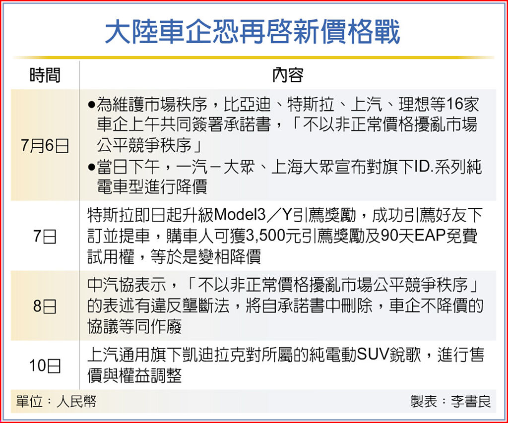 為防止車企價格戰失控,近日中國汽車工業協會(簡稱中汽協)召集比亞迪、特斯拉、上汽等16家業內巨頭簽署承諾書,不打價格戰,但該承諾僅隔兩天,就被中汽協以違反「反壟斷法」突然取消,而簽署承諾書當日迄今,有多家車企變相降價。在不砍價協議作廢下,市場人士憂心新一輪價格戰恐將啟動。
